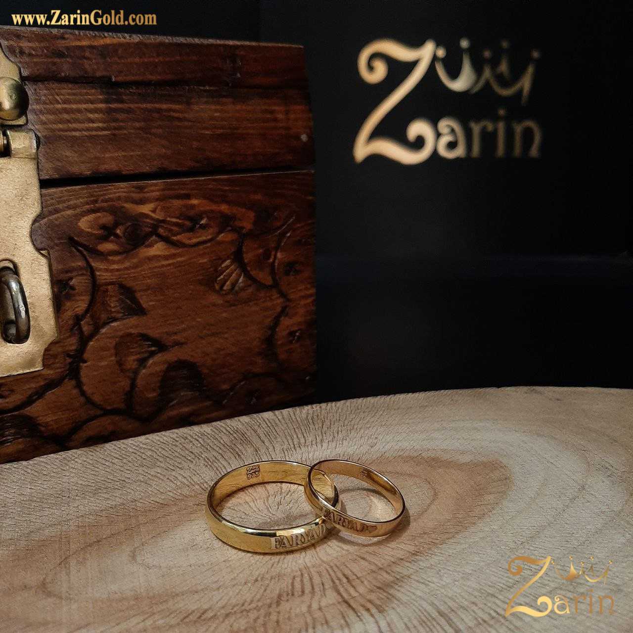 حلقه طلا ازدواج ساخته شده با طلا 18 عیار. حلقه طلا ساده در عین سادگی میتواند نشان دهنده عشق و علاقه شما به همسرتان باشد. در این حلقه طلا کلاسیک اسم مد نظر زوج عزیزمان با نوشتاری زیبا و با ظرافت تمام در قسمت خارجی حک شده و در داخل انگشتر طلا نیز تاریخ مد نظرشان حک شده که این اکسسوری طلا را خاص تر کرده.برای خرید حلقه طلای ازدواج با تیم زرین در تماس باشید .